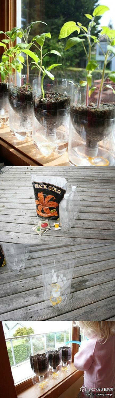 创意花盆——将 30 ~ 45 公分的绳子折成两半打结,如此一来,两端的绳头就可以利用“虹吸式原理”将瓶底的水吸进土壤里,保持土壤的湿度。最后在将土和种子装入宝特瓶內,这样就可以让瓶底的水通过绳子自动吸收水分了。