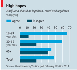 而在美国加州,支持大麻非药用合法的呼声正在不断高涨。2010年底,关于大麻合法化的19号提议以53.5%的选票被否决。但在2011年2月,《经济学人》发表的数据显示,在年轻人(19-29岁)和婴儿潮一代(30-64岁)中,有明显意愿支持大麻合法。即便是超过65岁的老人,其支持人数也高于反对者。