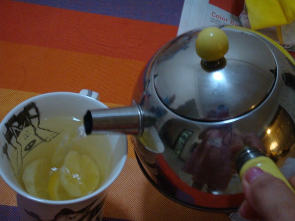 杯子里放两片腌好的柠檬,可以取一勺腌柠檬的蜂蜜汁放进杯子,