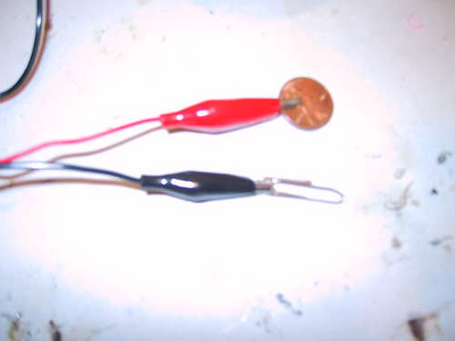 ● 在剩下的一根铜线的两端分别连上硬币和回形针。