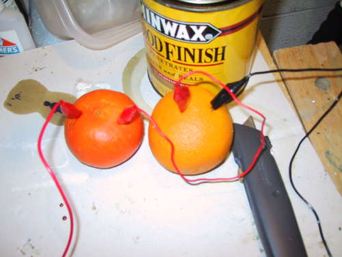 ● 现在,每只橙子上应该都伸出一根线,且两只橙子由一根铜线连着。